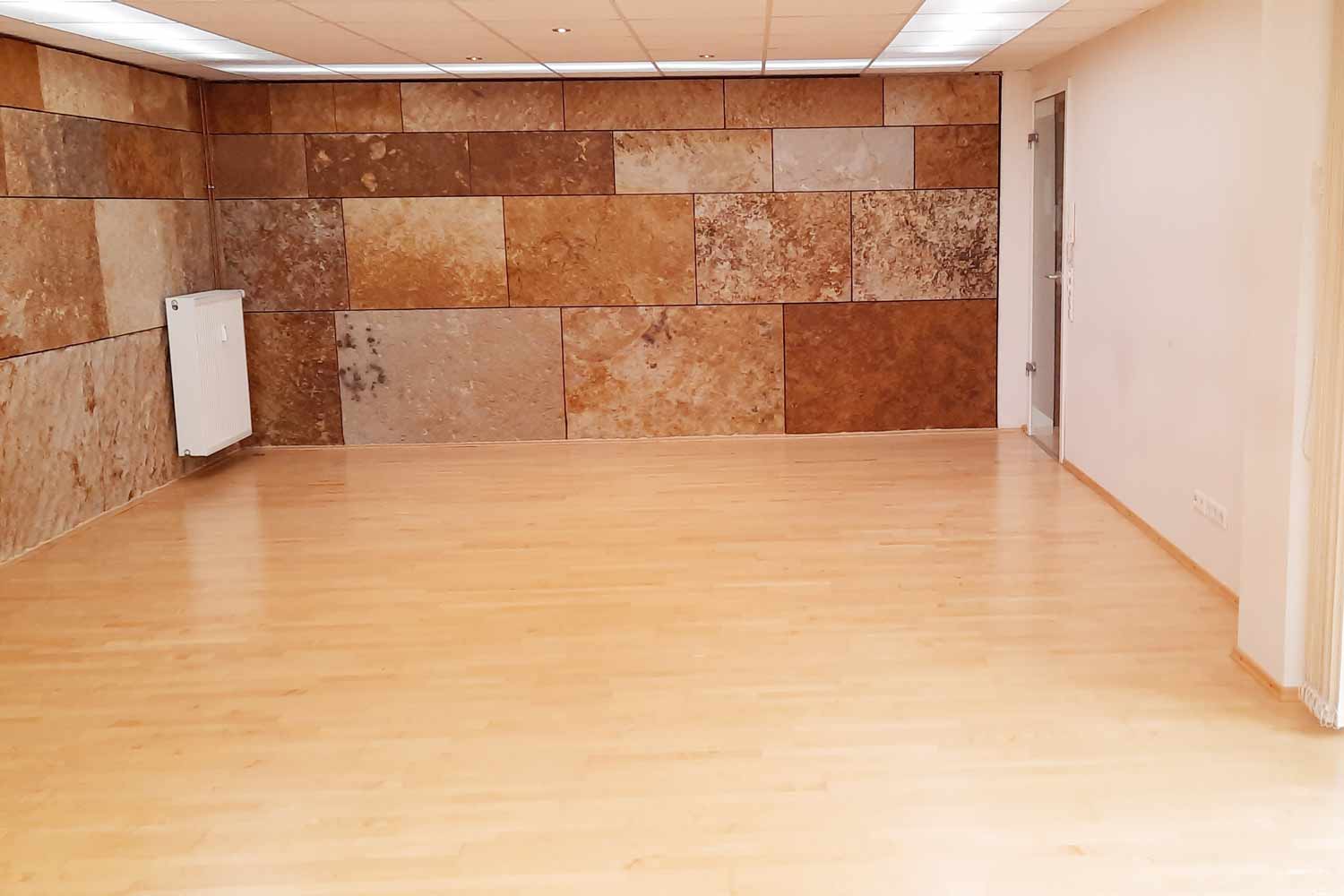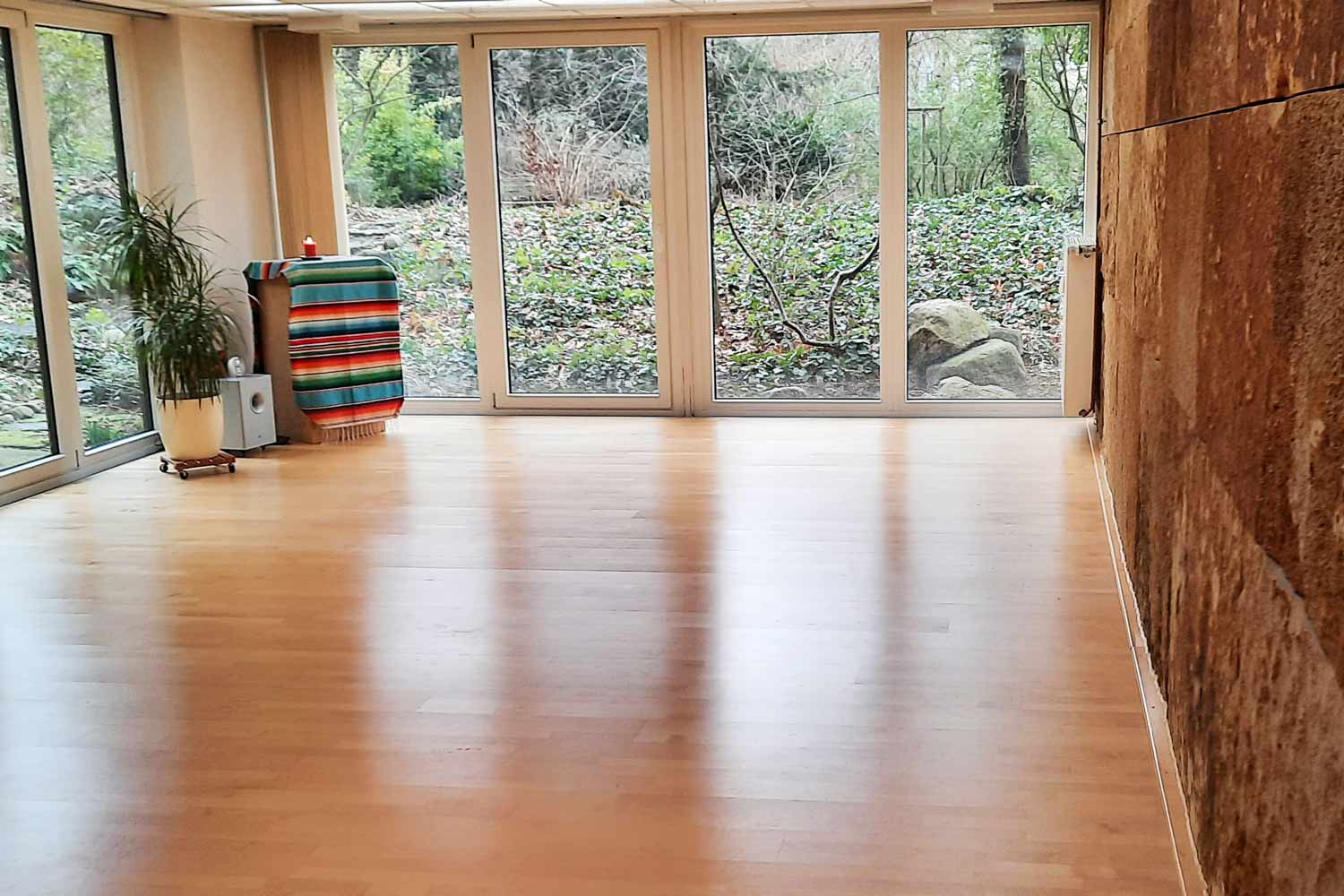Parkett, Musikanlage, Fensterfront zum Garten, Benutzung von Matten, Decken, Meditationskissen, Stühlen, Tischen und Flip Chart.