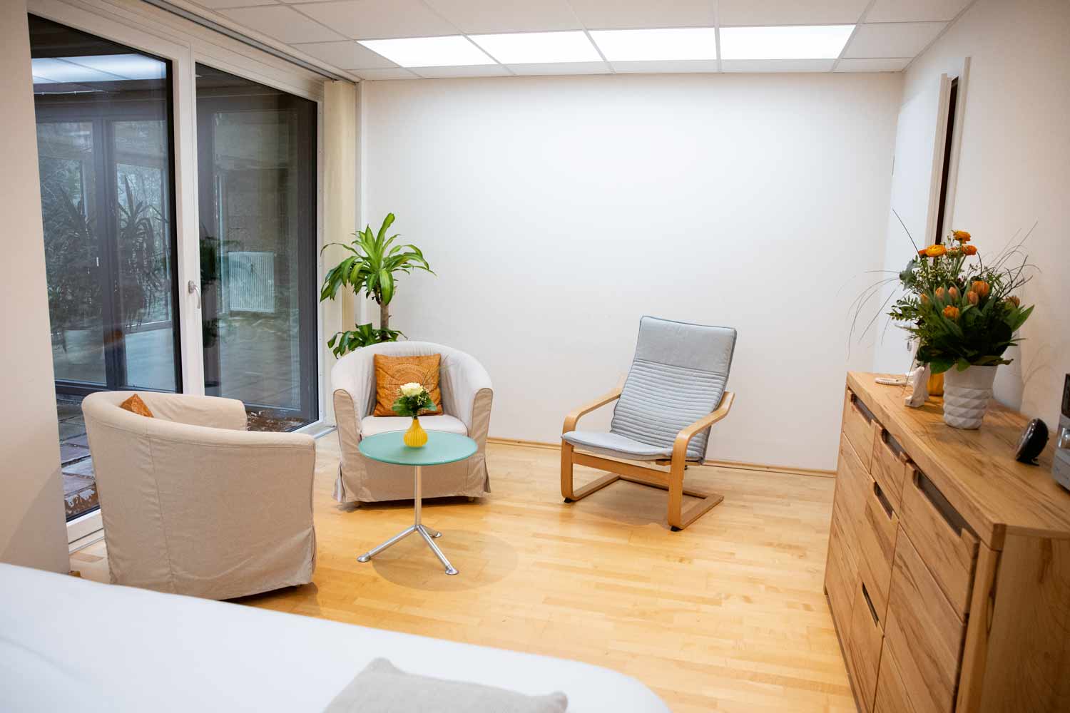 Parkett, Sessel und Tisch, Massageliege, Fensterfront zum Garten.
